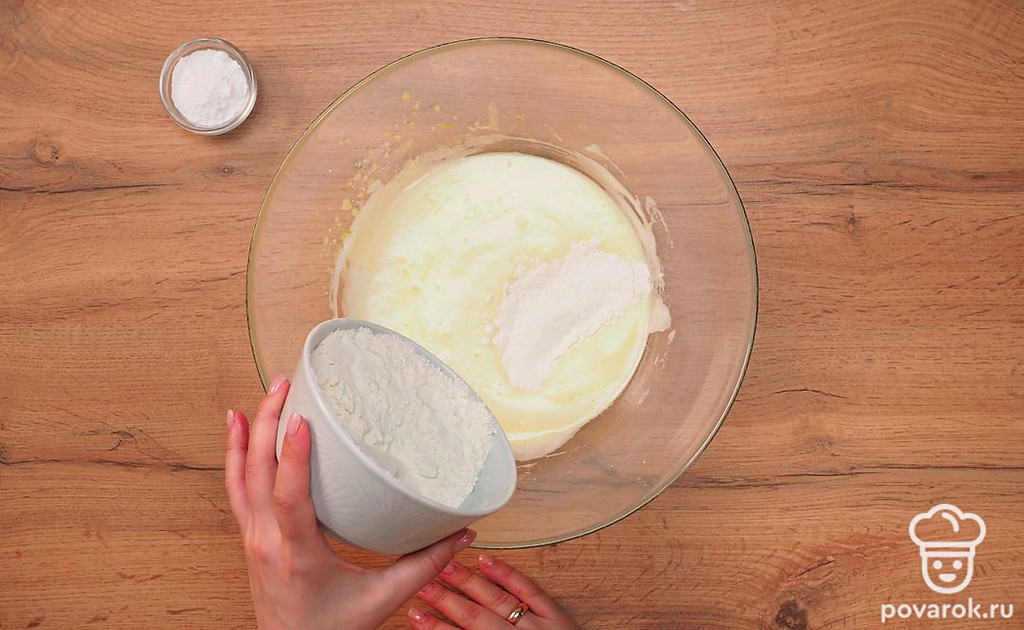 Продолжайте готовить тесто для быстрого бисквита к чаю. Добавьте к приготовленной смеси муку и замешивайте всего полминуты.