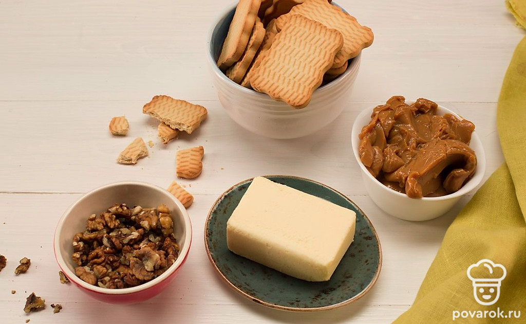 Заранее достаньте сливочное масло из холодильника. Мелко порубите грецкие орехи и раскрошите печенье.
