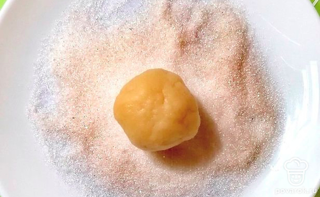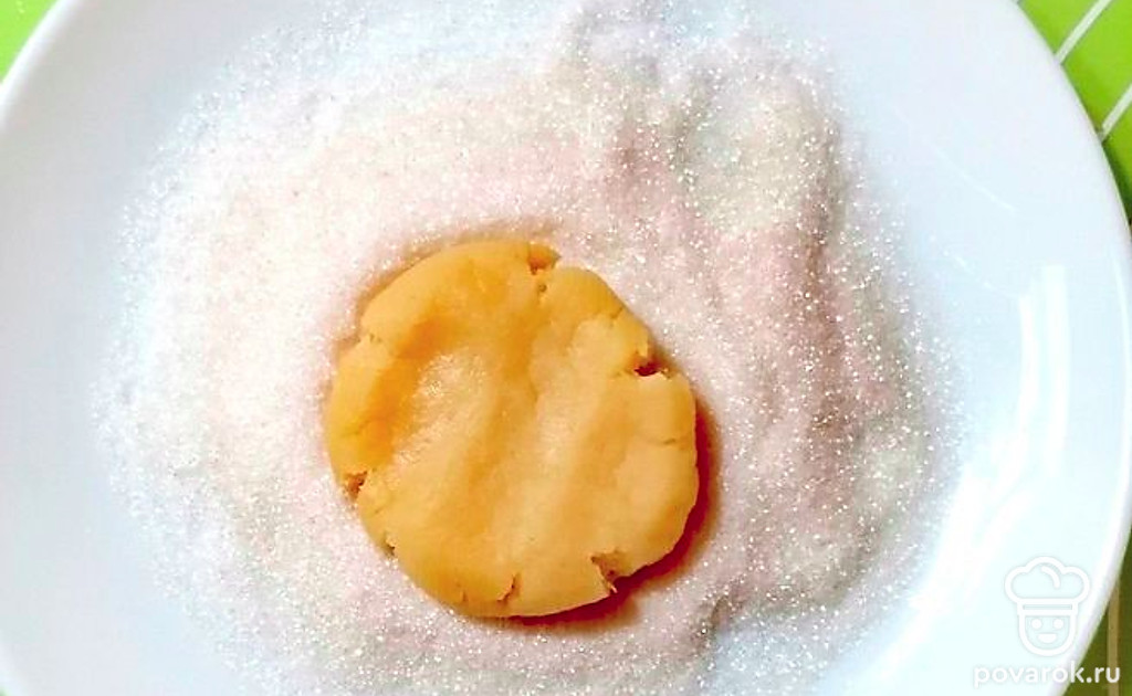 Положите шары по очереди в тарелку с сахаром. Придавите, делая лепешку толщиной в 1 сантиметр.