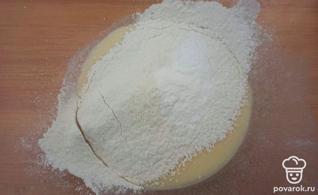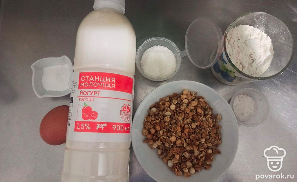 В посуду для замешивания влейте йогурт. Добавьте яйцо, сахар, разрыхлитель, соль и просейте муку.