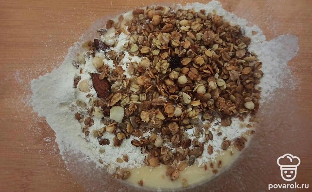 Добавьте мюсли и хорошо перемешайте до однородной консистенции. Получится густая масса.