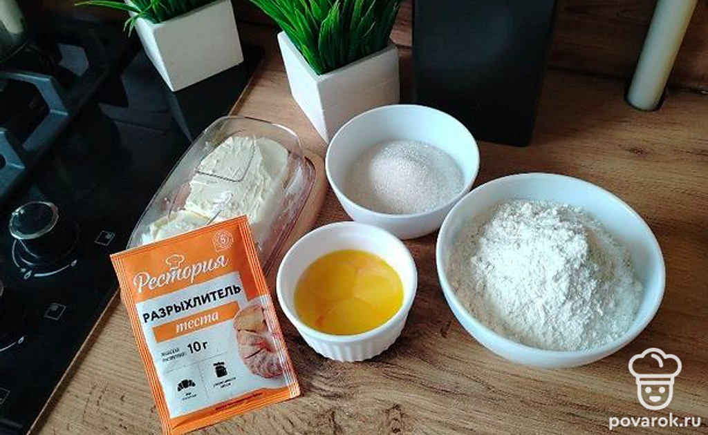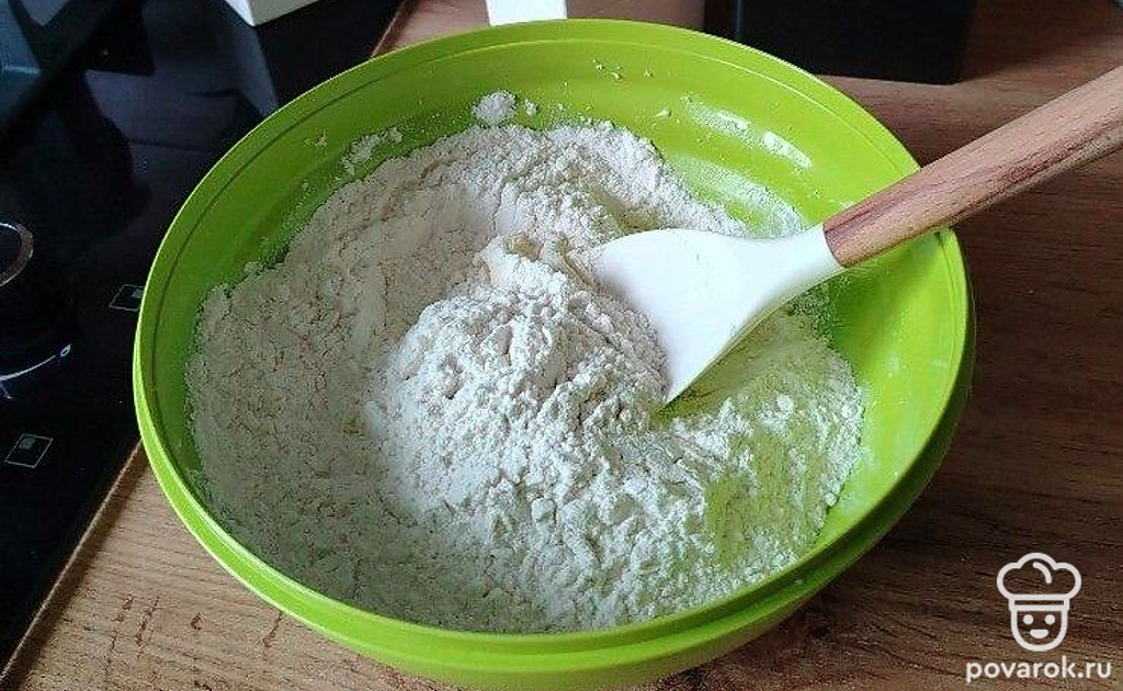 Введите просеянную муку и разрыхлитель теста. Замешайте эластичное тесто.
