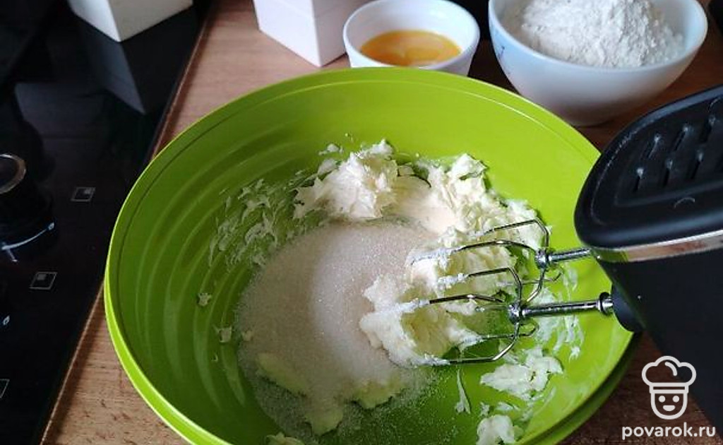 Мягкое сливочное масло взбейте миксером. Добавьте сахар и еще раз взбейте. Затем добавьте желтки и еще раз взбейте.
