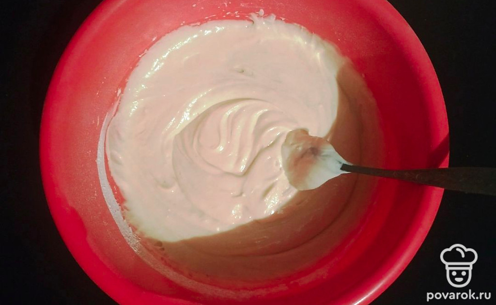 В яично-сахарную смесь добавьте растопленный маргарин. Перемешайте и всыпьте муку и разрыхлитель. Перемешайте аккуратно миксером на малой скорости. Тесто получается воздушное, консистенции сметаны.