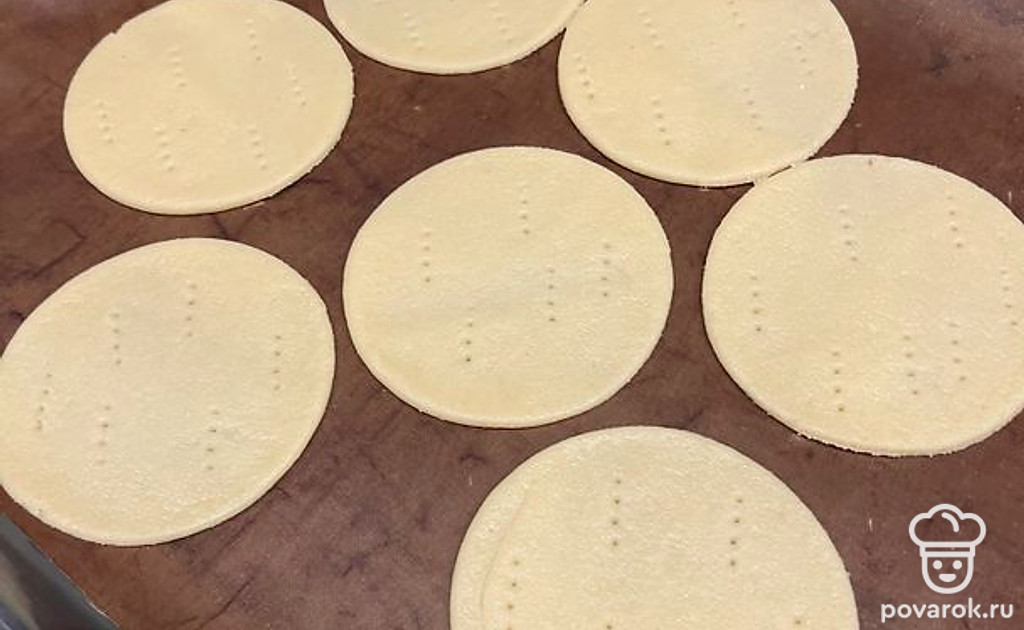 Раскатайте тесто в пласт толщиной 3-5 миллиметров и вырежьте кружочки. Выпекайте при 190-200 градусах не более 15 минут (у меня уходит 12-13 минут на одну партию).