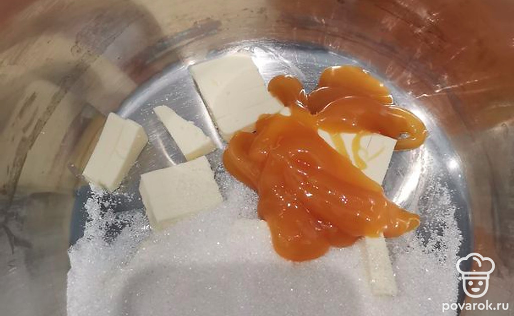 В кастрюлю высыпьте сахар, мед и сливочное масло.