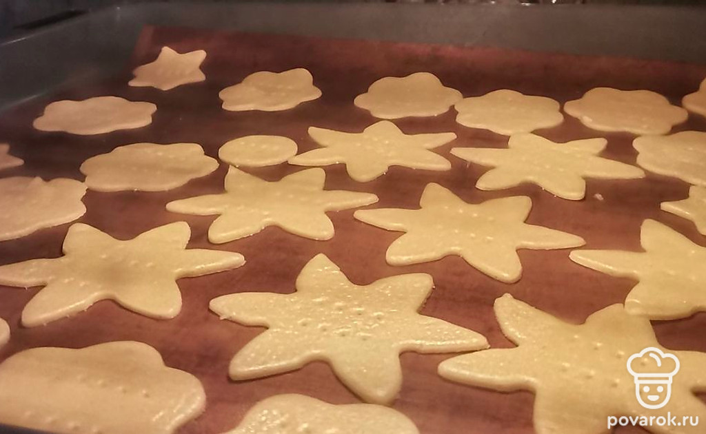 Далее раскатайте тесто. Вырежьте фигурки. Отправьте выпекаться на 5-7 минут при 180 градусах.