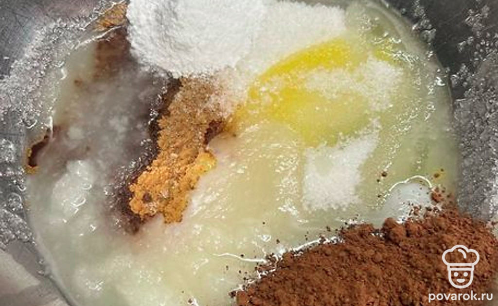 В миску добавить яйцо, сахар, какао, масло, изюм, грецкий орех. Хорошо перемешать.
