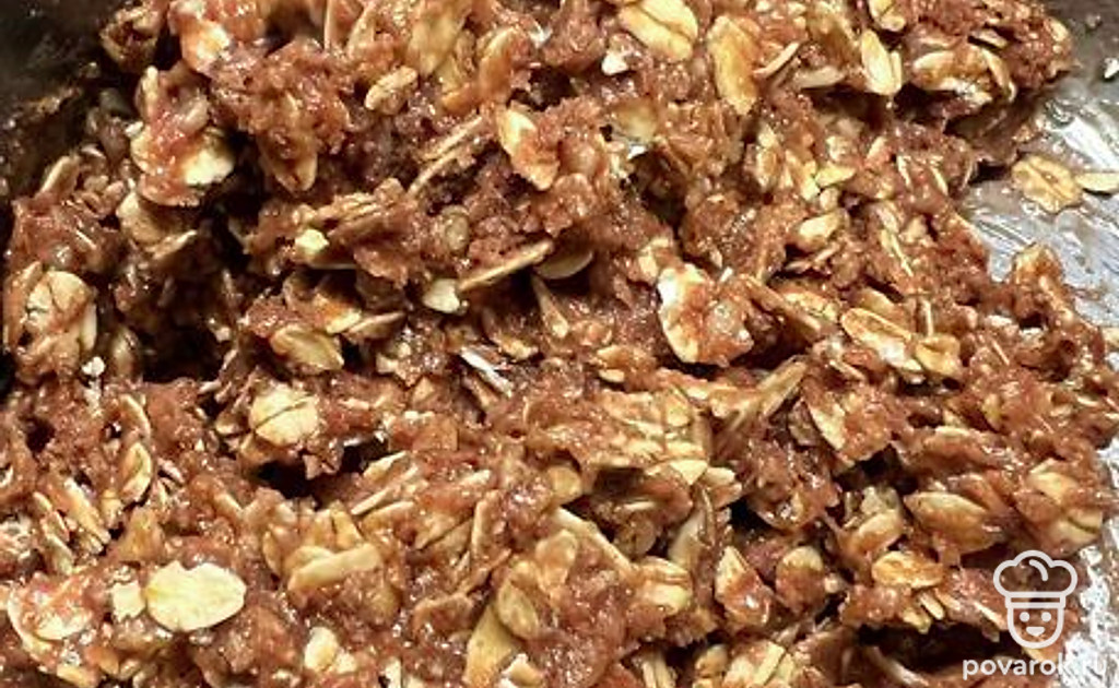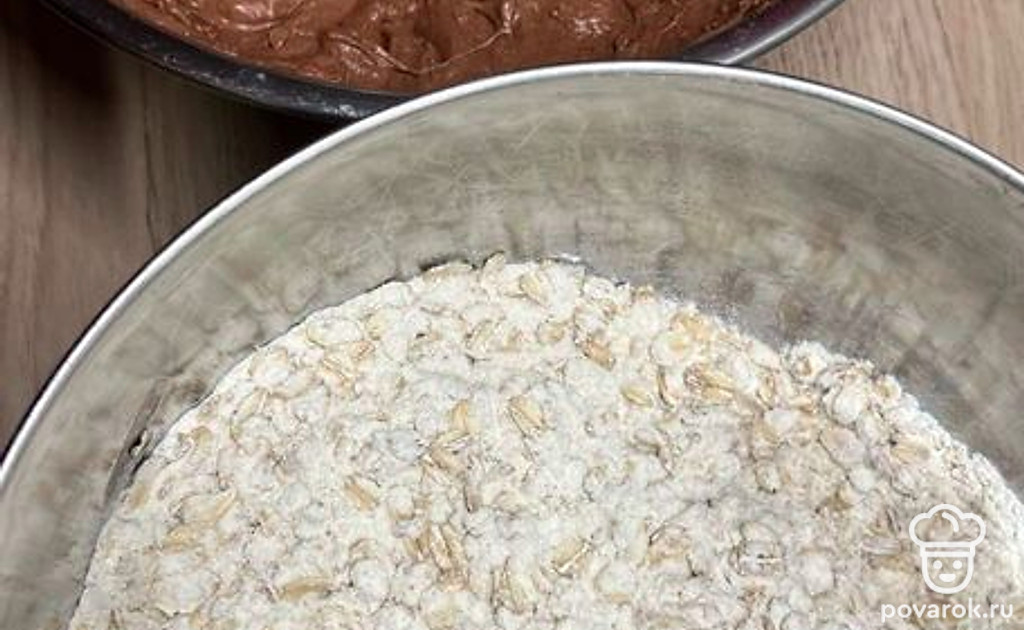 Во второй миске смешать муку, разрыхлитель, овсянку.
