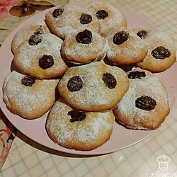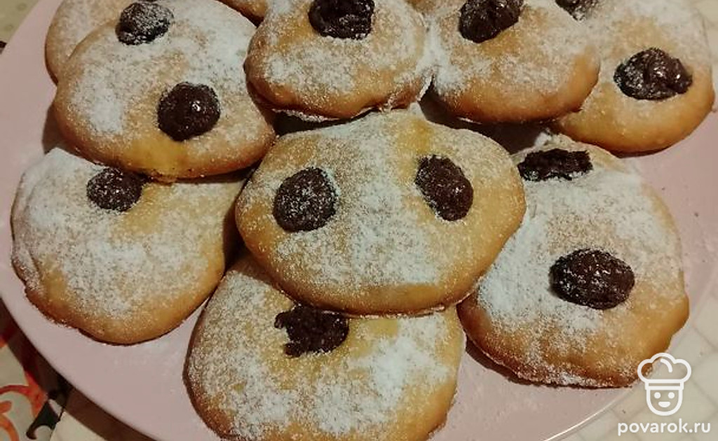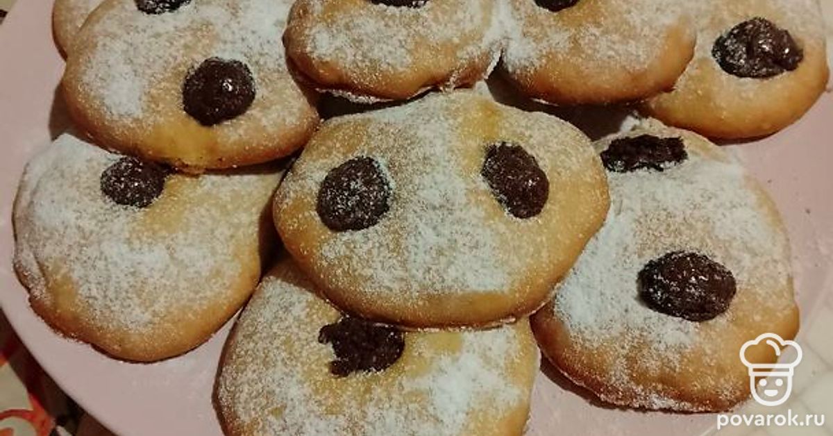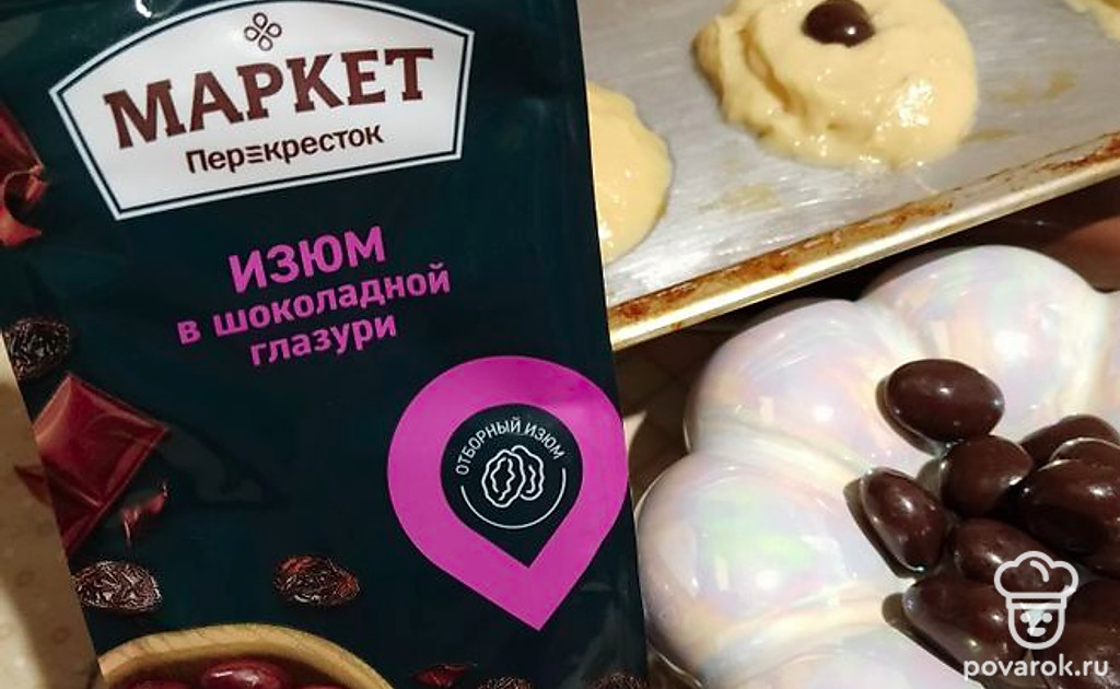 Вырезать из теста кружочки. На середину каждого положить по 1-2 изюминки в шоколаде. Выпекать в духовке при 170-180 градусах до золотистого цвета. Томить примерно 20 минут.
