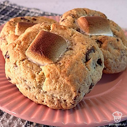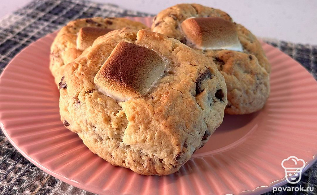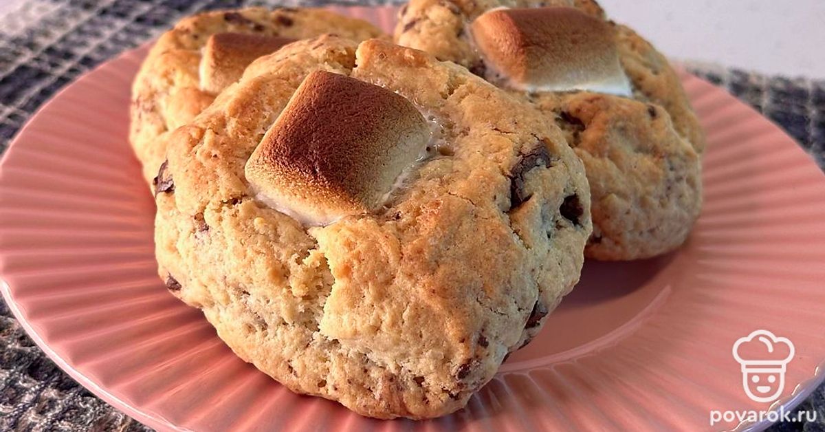 Сформируйте печенье (у меня получилось 6 штук по 100 граммов). В центре сделайте углубление и выложите маршмеллоу. Закрепите по бокам.