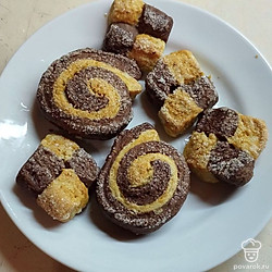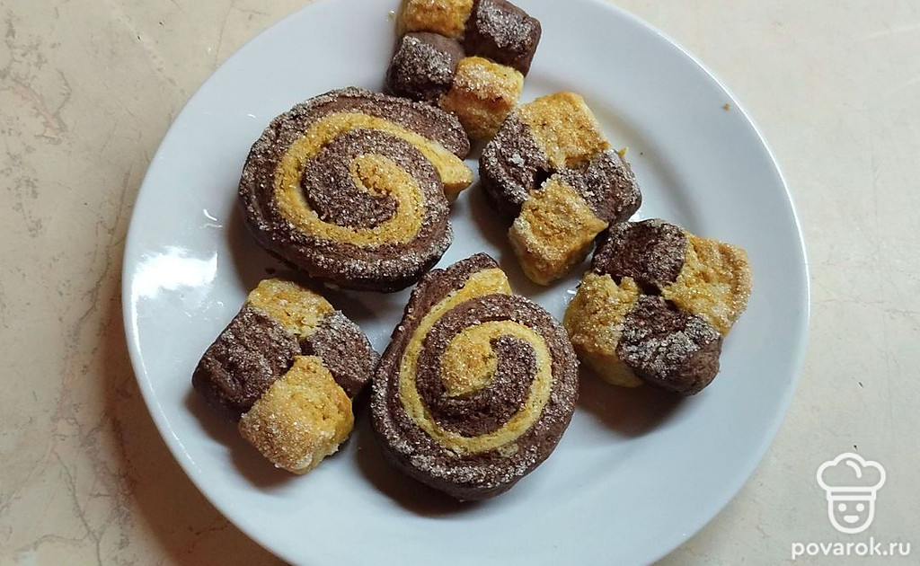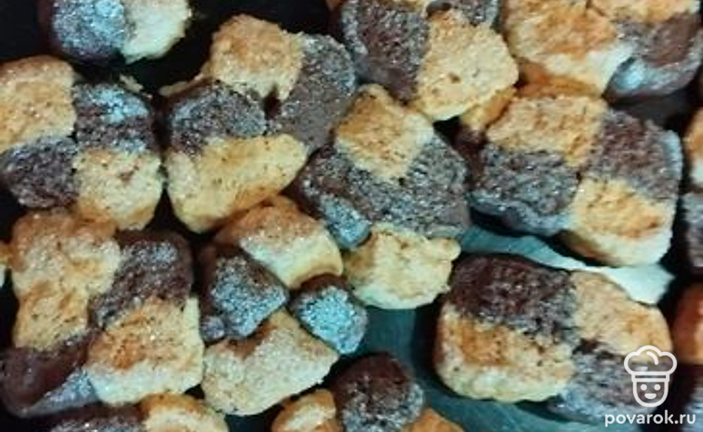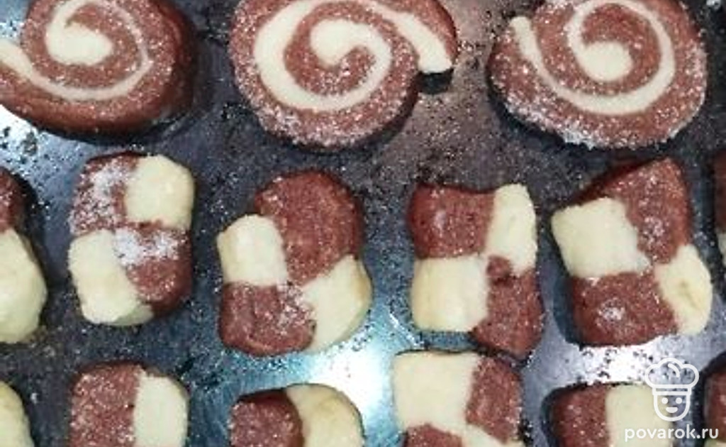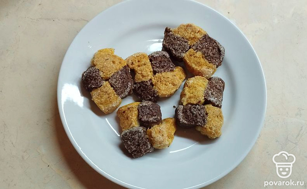 Каждый шахматный кусочек обмакните в сахар и выложите на противень. Поставьте в разогретую духовку на 40-45 минут.
