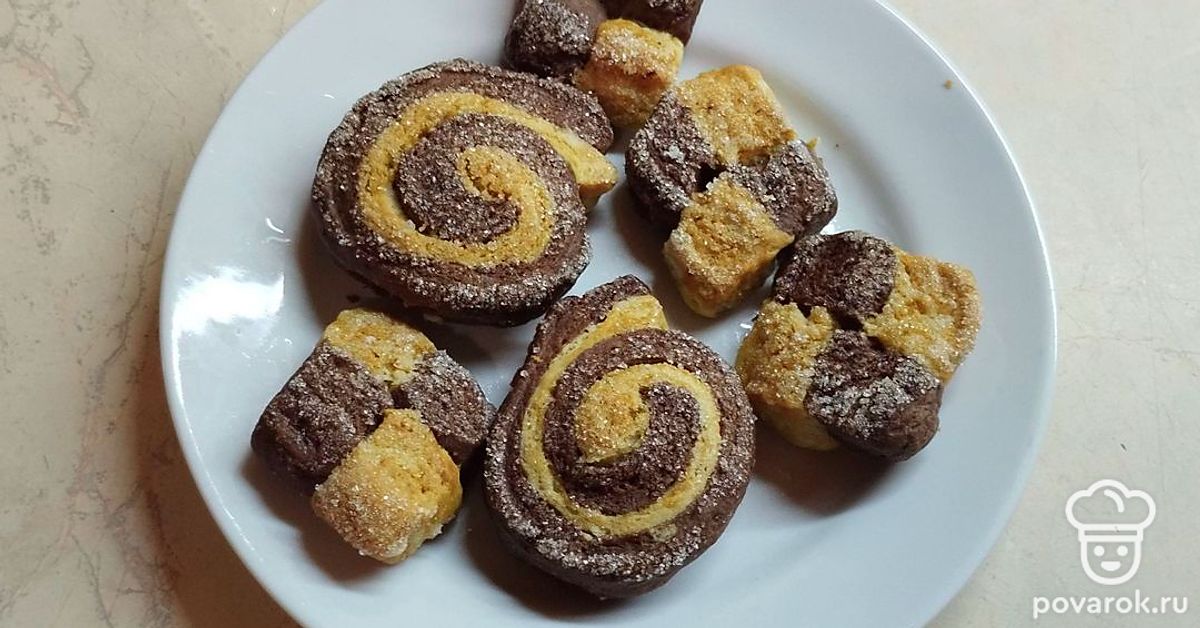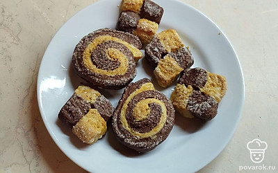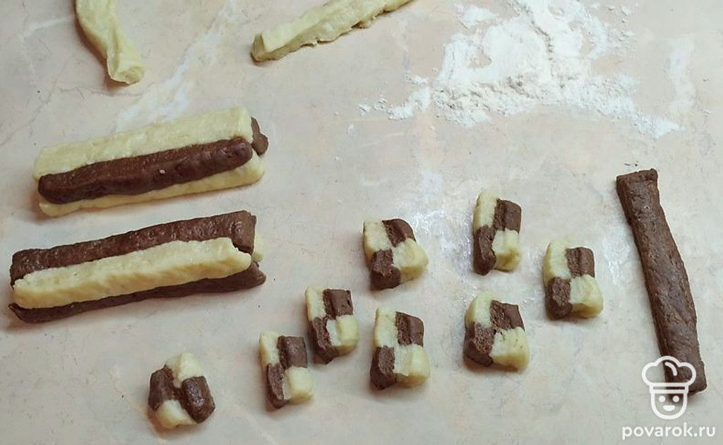 Сложите полоски в шахматном порядке, слегка спрессуйте, разрежьте на кусочки.