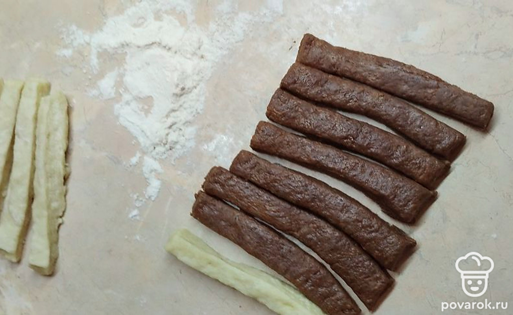 Достаньте из холодильника два вида теста, раскатайте толщиной около 1,5 сантиметров. Разрежьте на полоски шириной 1,5 сантиметра.