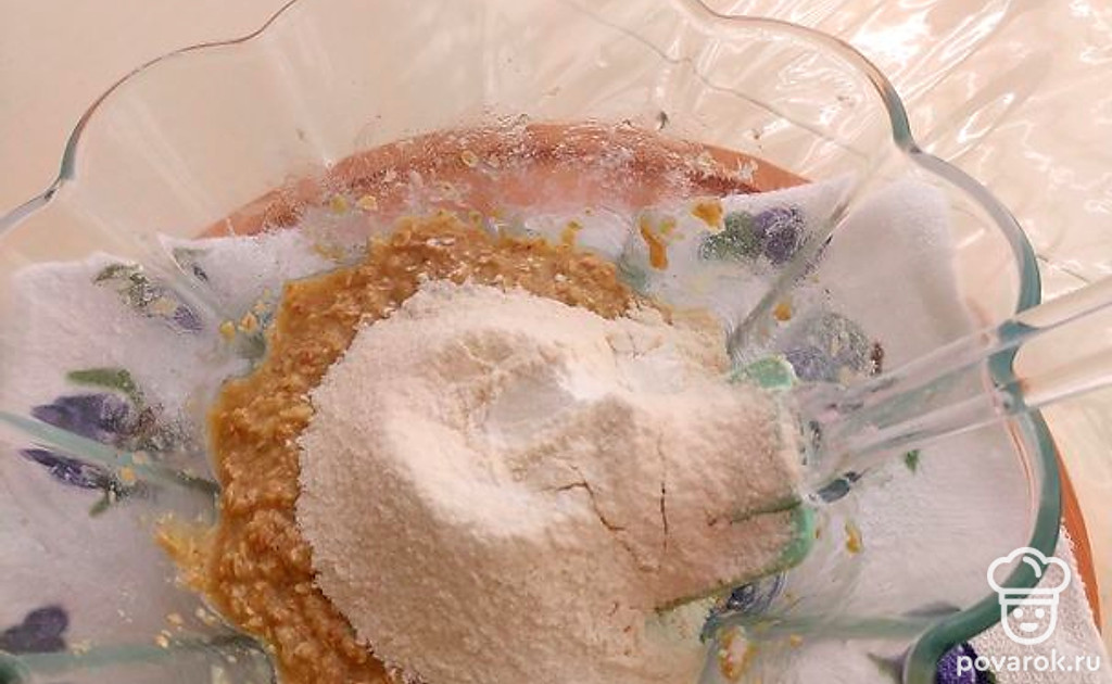 После всыпьте муку и разрыхлитель. Обязательно все просейте и перемешайте.
