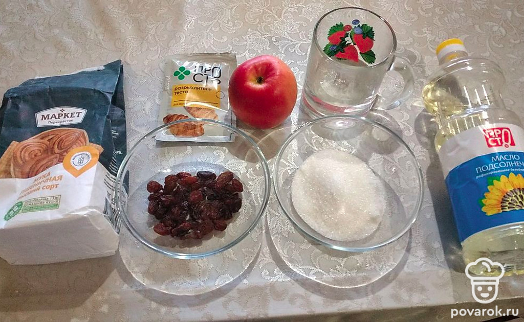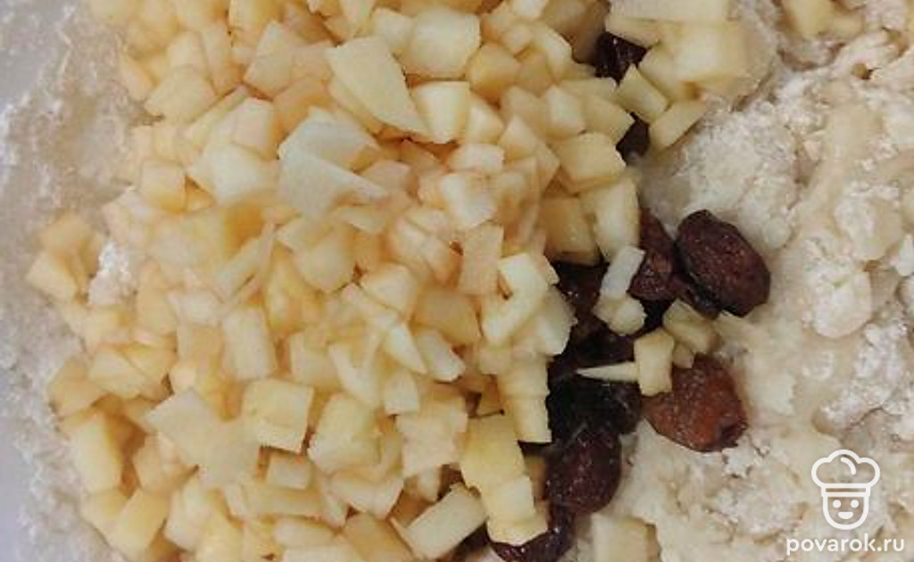 Добавьте промытый изюм, мелко нарезанное яблоко (очищенное от кожуры), перемешайте.