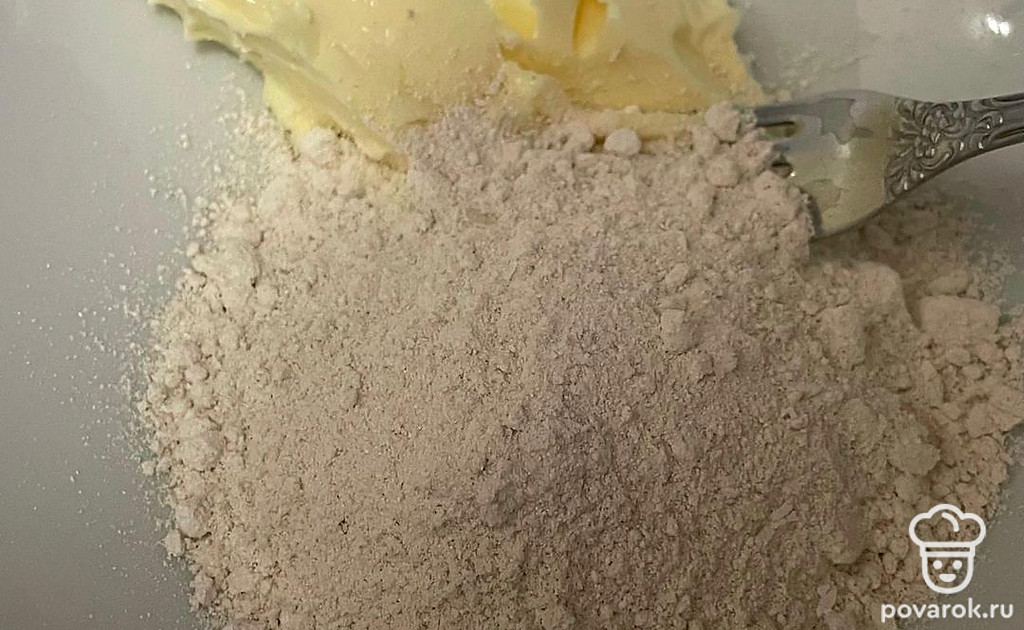Овсянку превратите в муку и смешайте с мягким маслом.