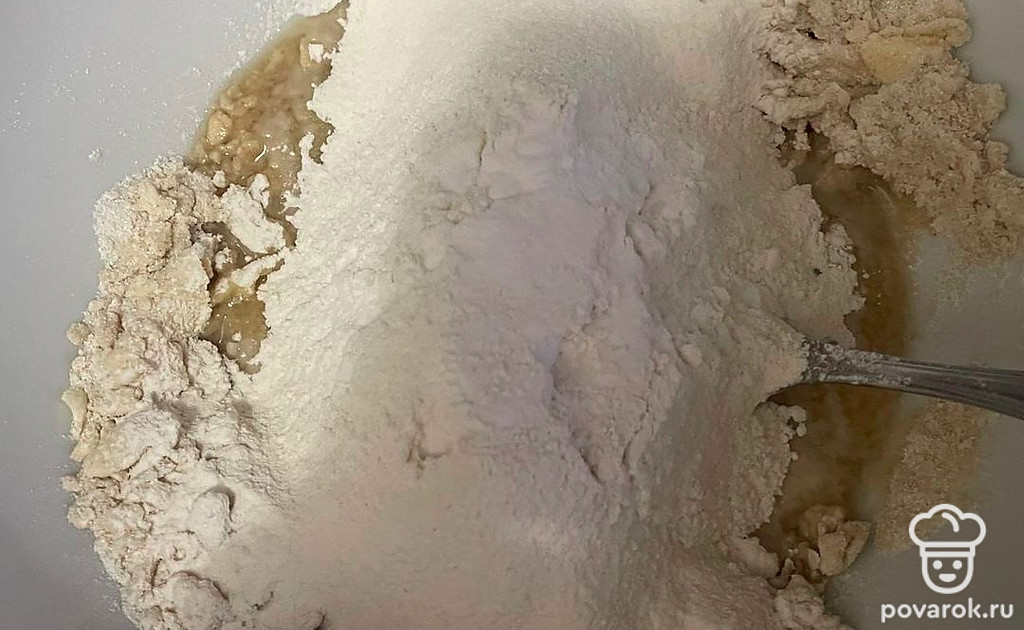 Муку просейте и смешайте с содой, добавьте к остальным ингредиентам. Замесите тесто и уберите его в холодильник на 20 минут.