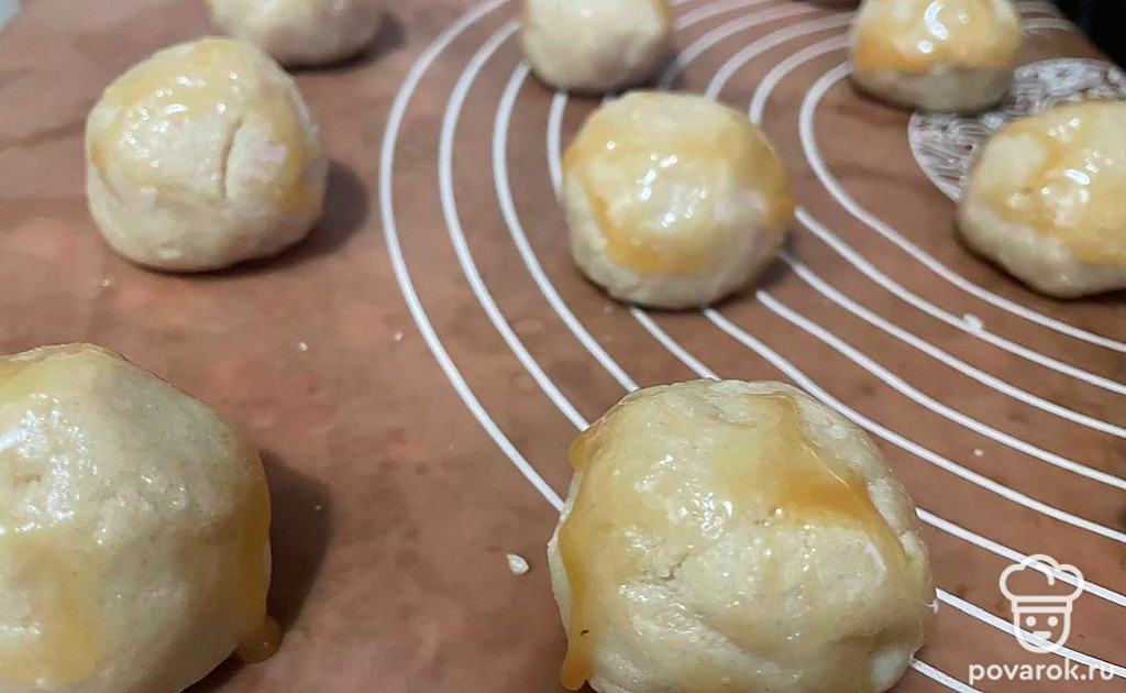 Сформируете из теста шарики одинакового размера, сверху смажьте каждый шарик медом. Выпекайте печенье в духовке, разогретой до 180 градусов, 15-20 минут.
