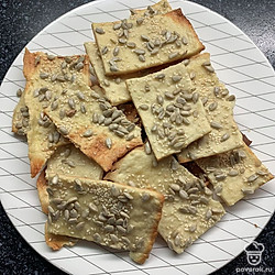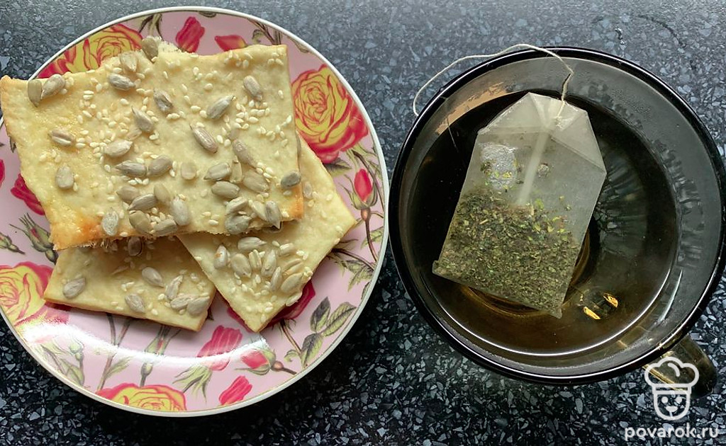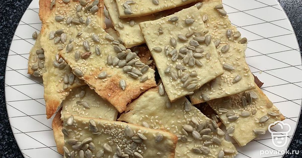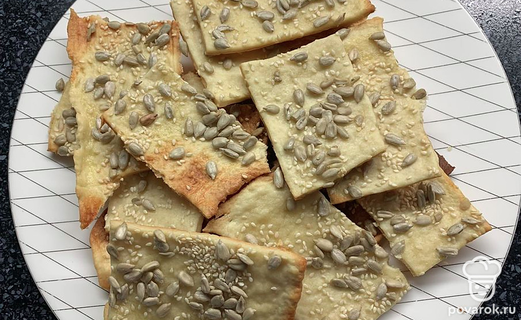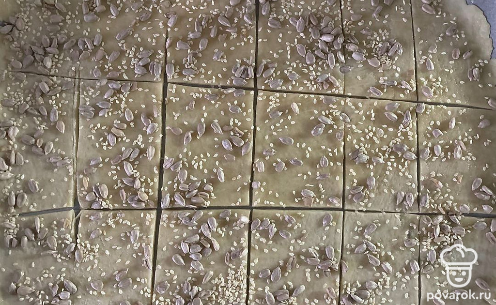 Тесто смазать яйцом и посыпать семечками. Разрезать на небольшие кусочки. Выпекать в духовке при 180 градусах до готовности.