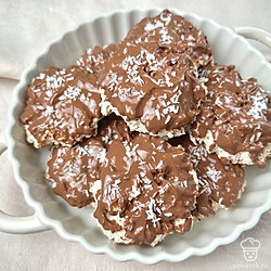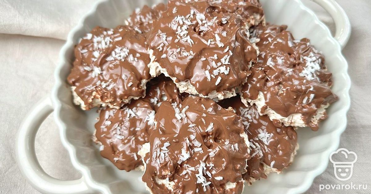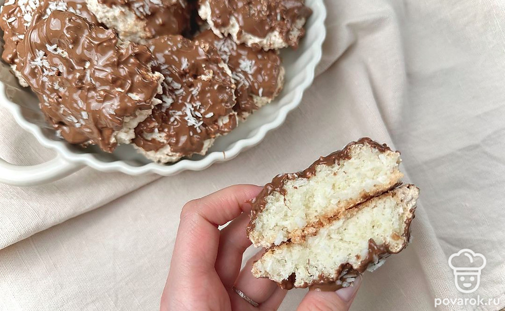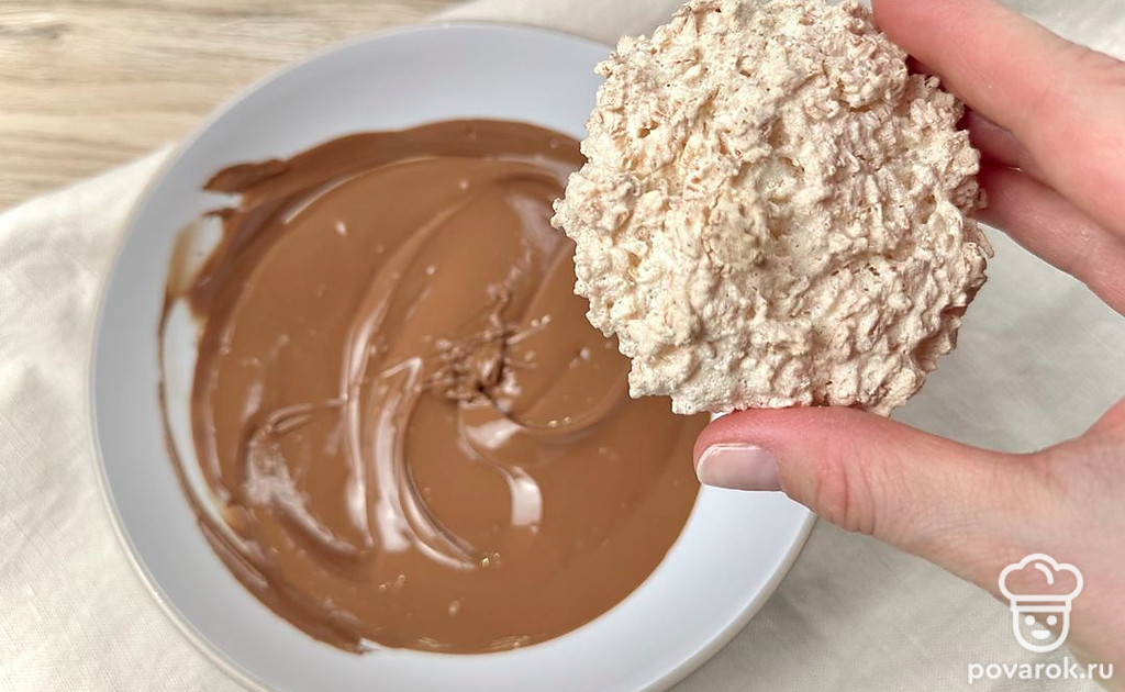 Готовое печенье окуните в шоколад и посыпьте кокосовой стружкой.