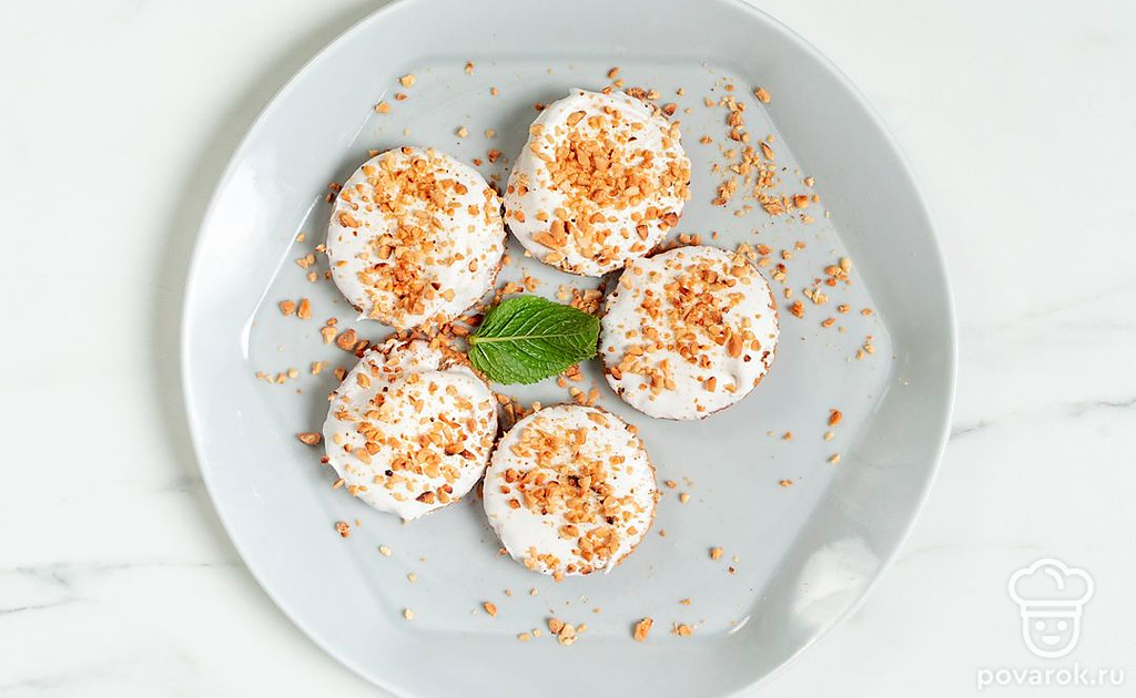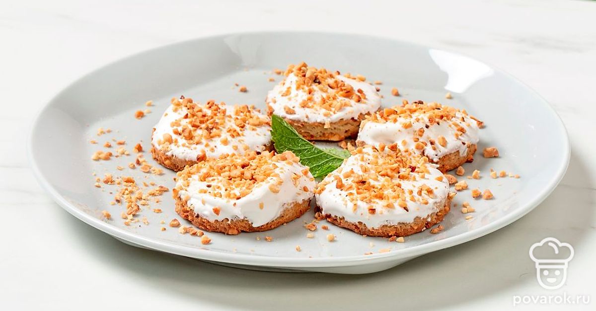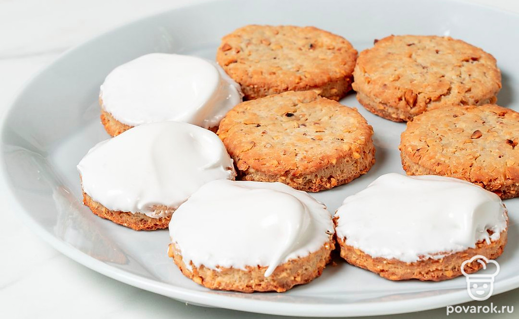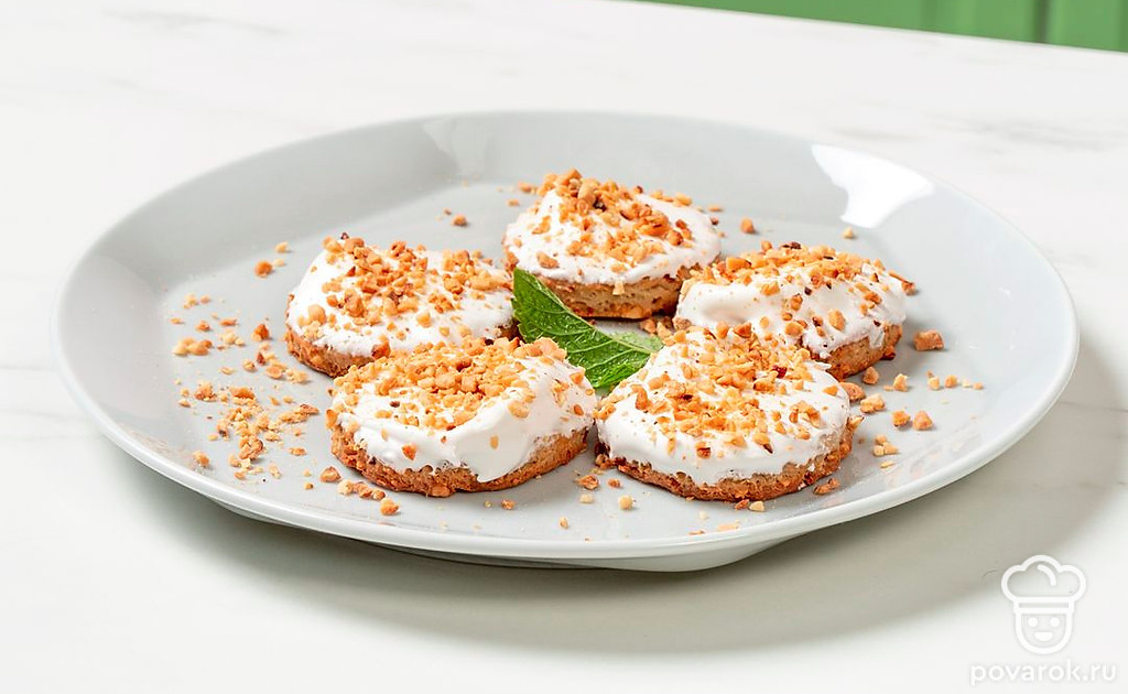Смажьте глазурью готовое печенье, а сверху посыпьте ореховой крошкой.
