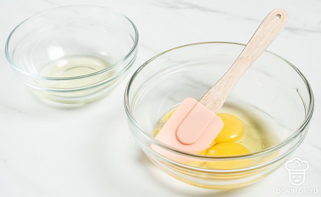 Отделите белок от жертка у одного яйца. Вбейте 2 яйца и один желток в миску, в которой будете делать тесто. 1 белок оставьте для глазури.