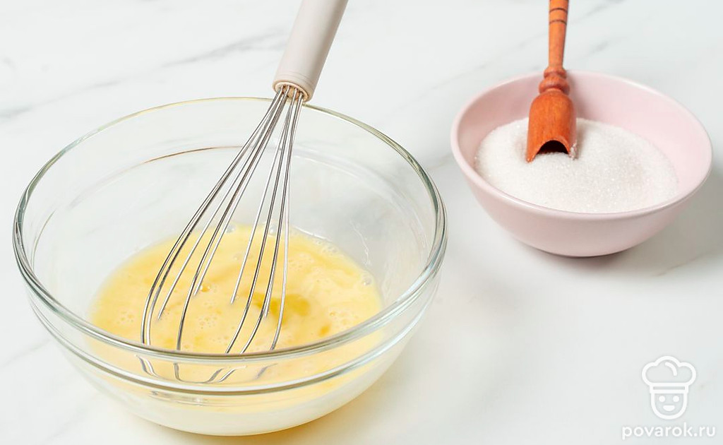 Всыпьте в яйца 5 ст. л. сахара. Взбейте блендером или венчиком до легкой пены.