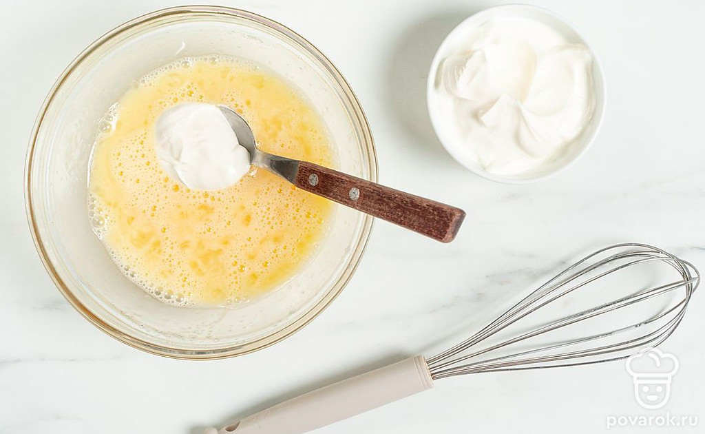 Добавьте в яйца с сахаром сметану, перемешайте массу до однородности.
