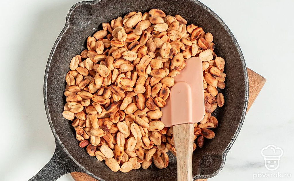 Обжарьте арахис в течение 5-7 минут на сухой сковороде, а затем остудите.