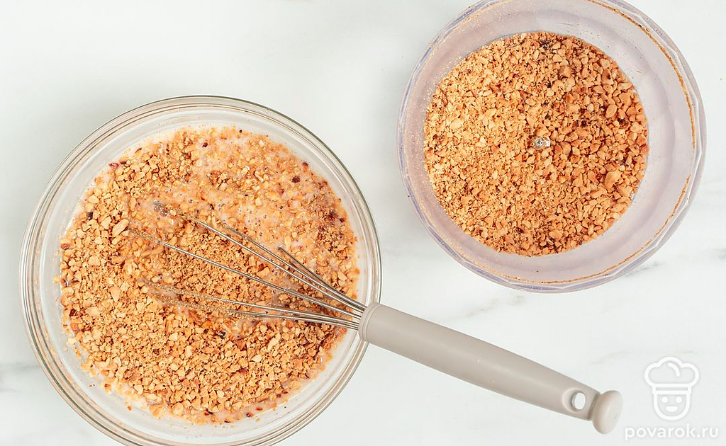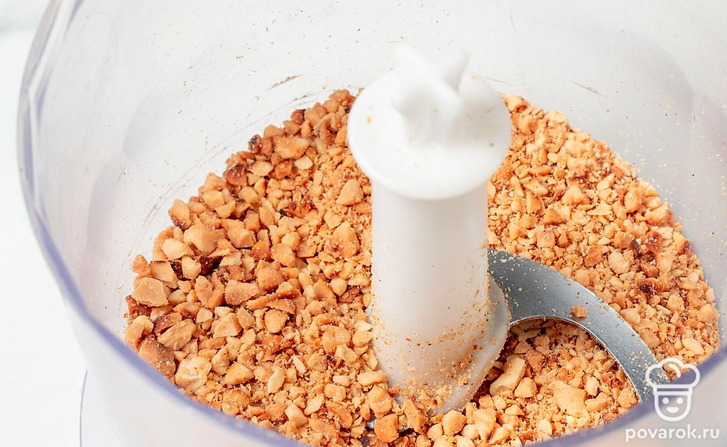 Слегка измельчите арахис в блендере. У вас должна получиться крошка, доводить орехи до состоятия муки не нужно.