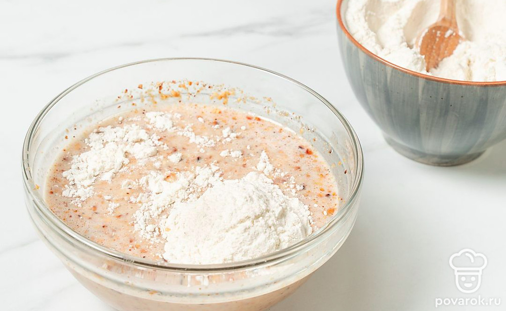 Всыпьте в смесь муку. Подсыпайте ее поэтапно, каждый раз перемешивая и проверяя консистенцию теста между этапами.