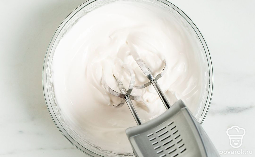 Взбейте белок с оставшимся сахаром до устойчивой пены.