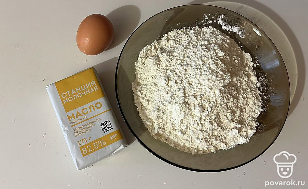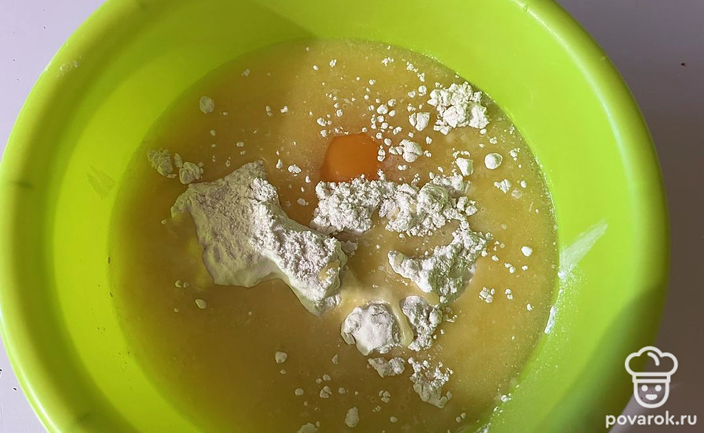 В глубокую емкость поместите растопленное сливочное масло, яйцо, сахар и муку с разрыхлителем.