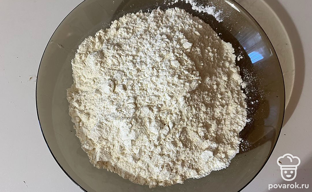 Муку просейте в отдельную тарелку и перемешайте ее с разрыхлителем.