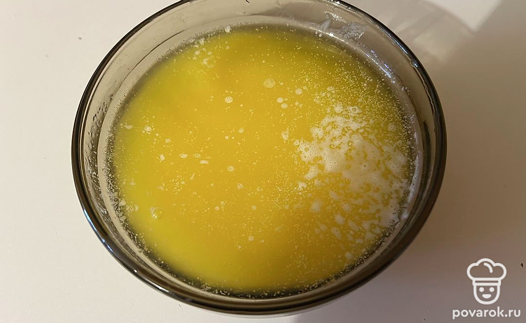 Сливочное масло растопите в отдельной емкости до жидкого состояния в микроволновке.