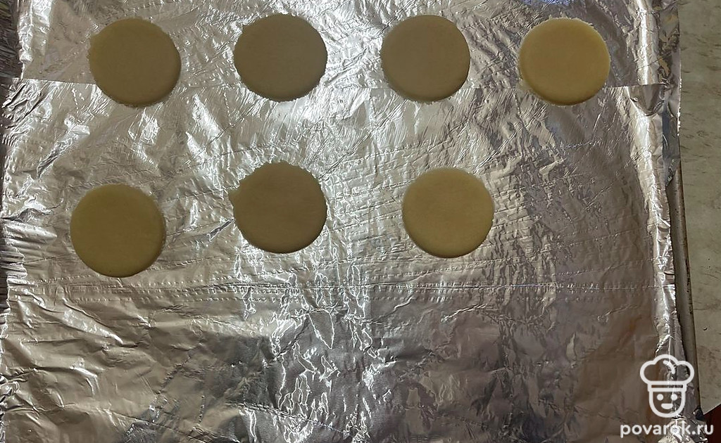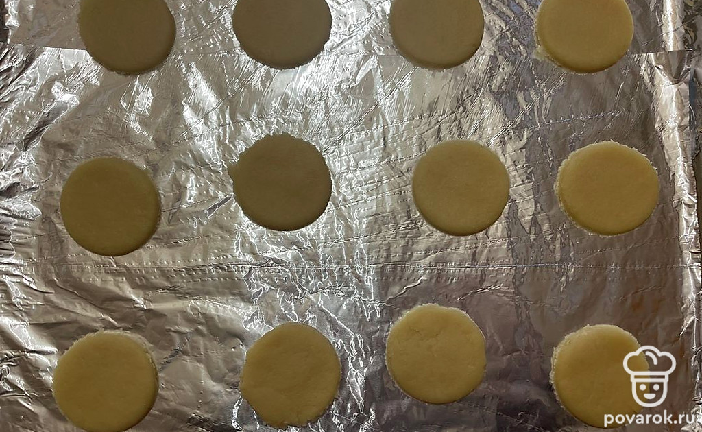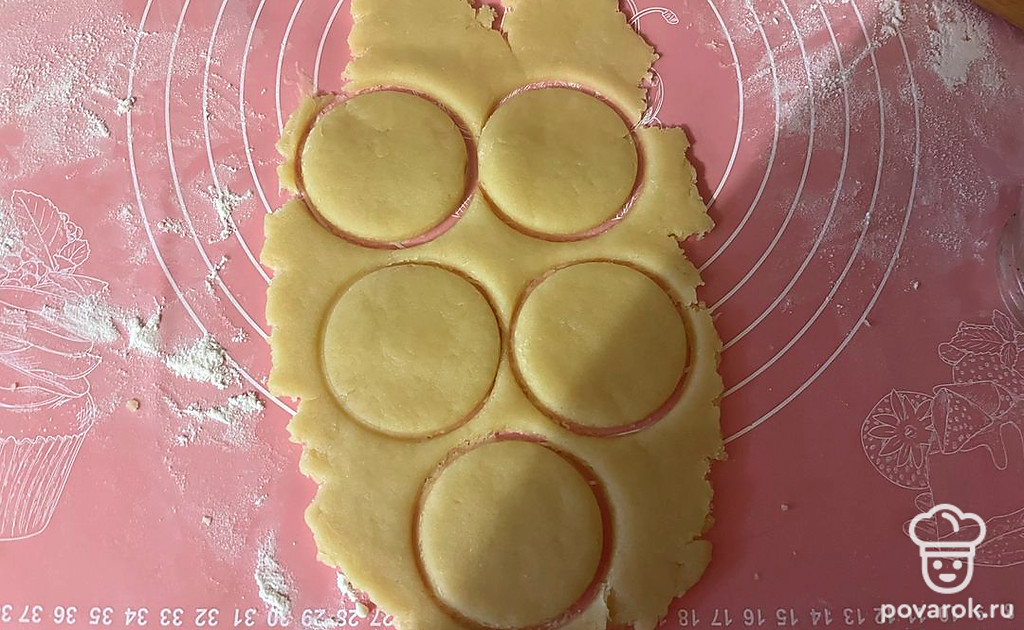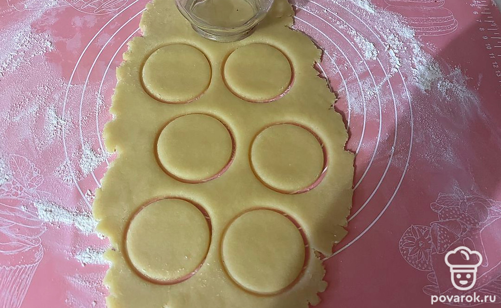 При помощи формочки вырежьте из теста печенье (форму с легкостью можно заменить на банку с горлышком нужного диаметра).