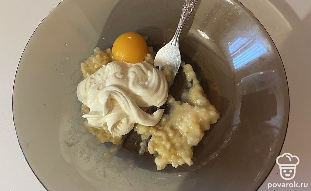 К банановому пюре добавьте желток, сметану и, по желанию, сахар.