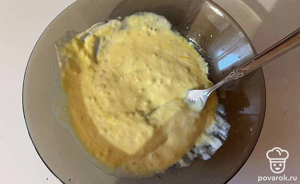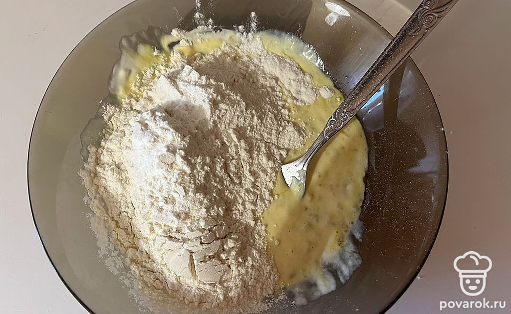 К жидкой смеси просейте 100 грамм муки и добавьте разрыхлитель.