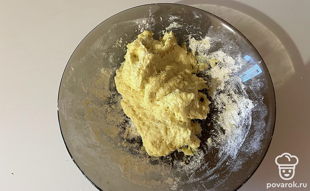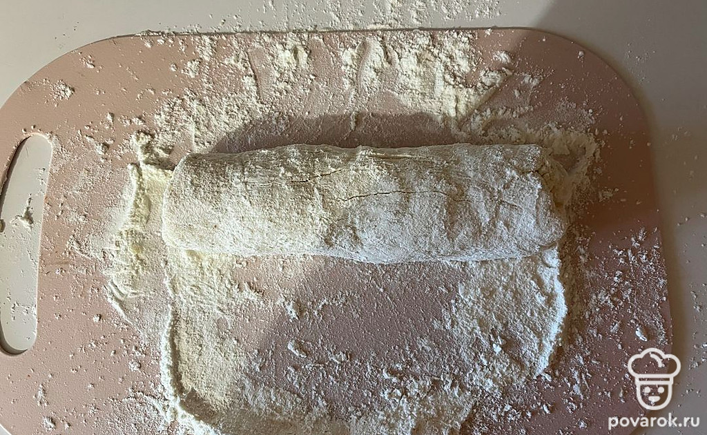 Рабочую поверхность припылите оставшейся мукой. На ней раскатайте в толстую колбаску тесто.
