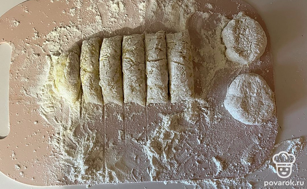 Колбаску теста нарежьте на 8 кусочков. Из каждого куска сформируйте круглое печенье.