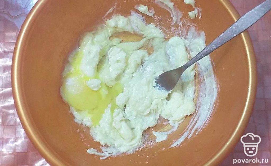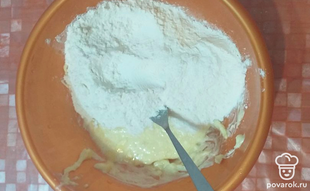 Всыпать просеянную муку с разрыхлителем, замесить тесто.