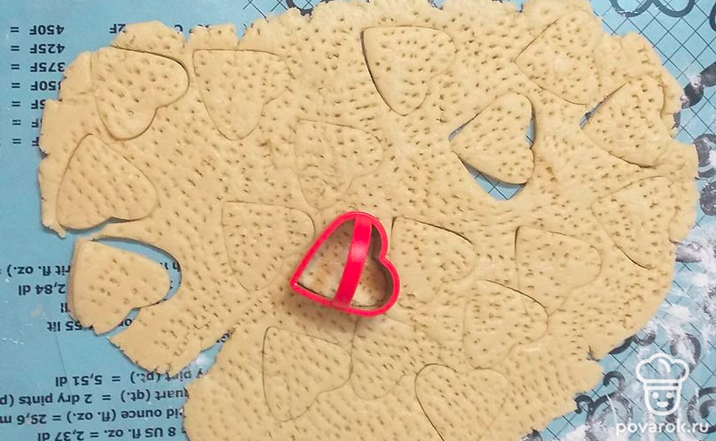 Раскатать пласт толщиной 0 5 сантиметра, нанести дизайн вилкой. С помощью формочек для теста вырезать печенье.