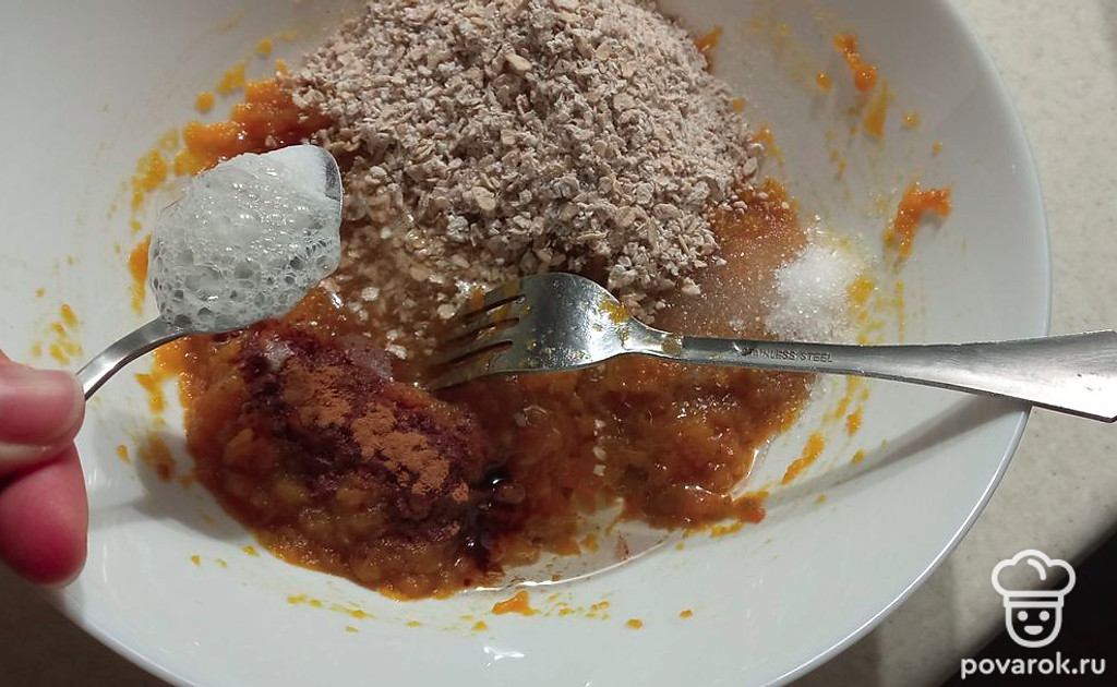 Добавить сахар, овсянку, масло и гашенную соду, все перемешать. Добавить муку и замесить тесто.