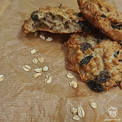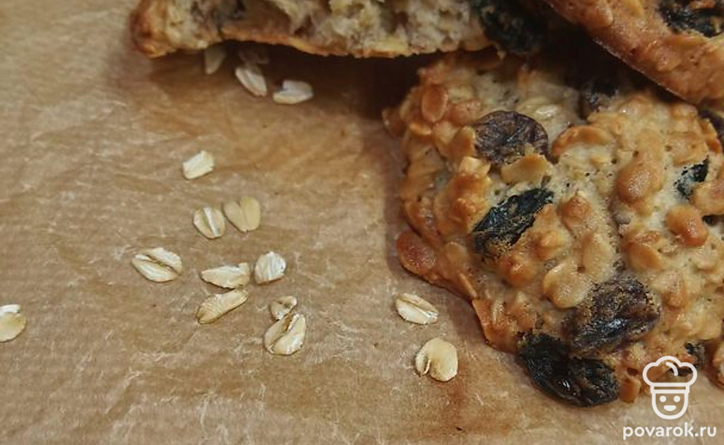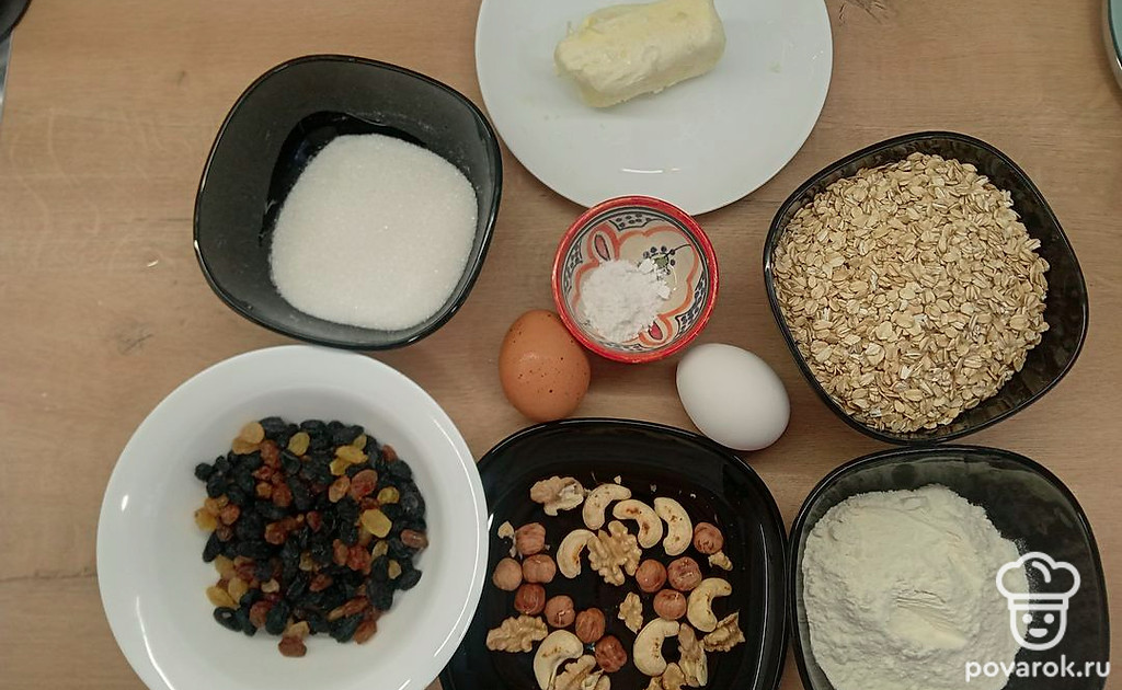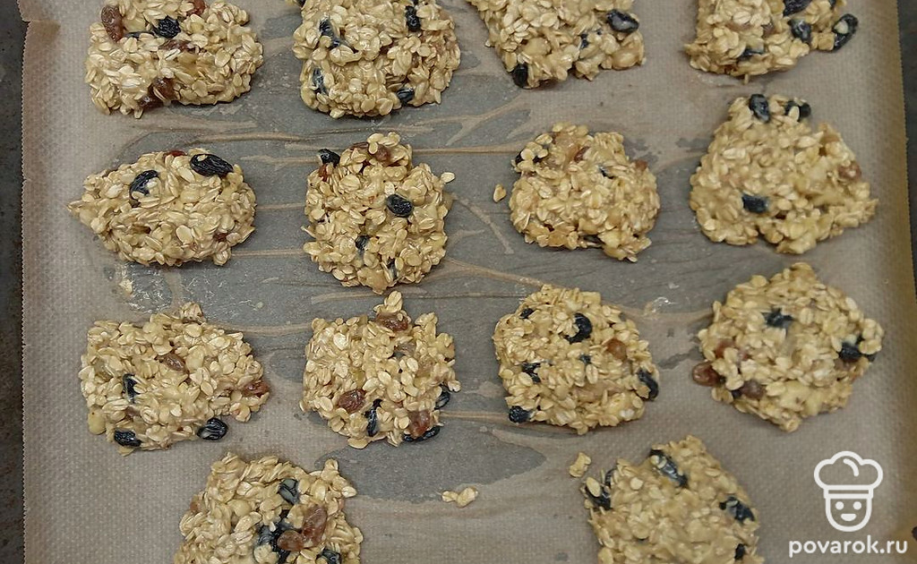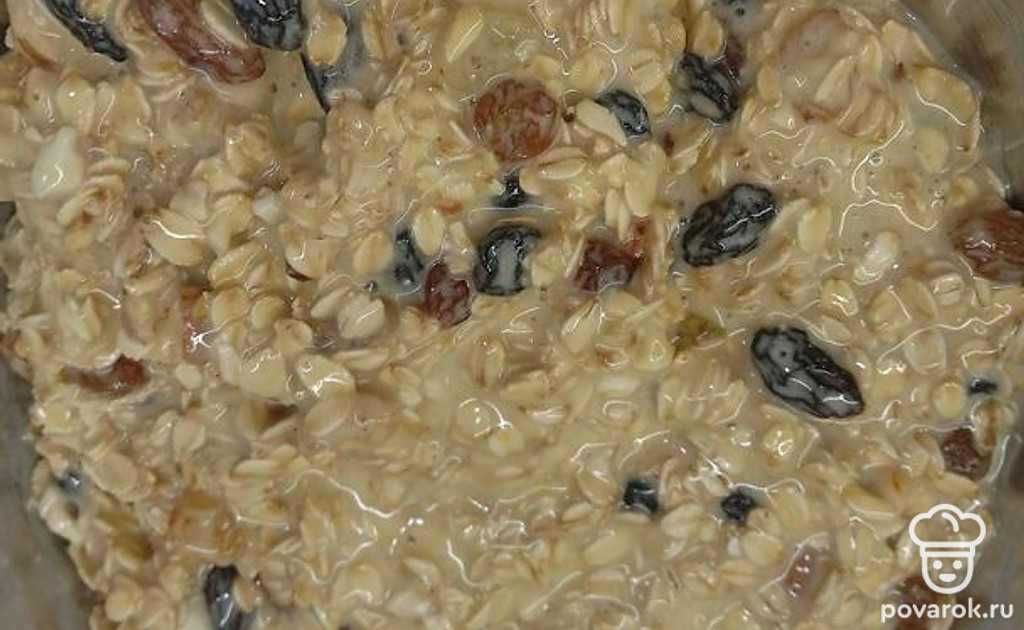 Добавляем изюм и измельченные орешки и перемешиваем. Оставляем полученную смесь на 30 минут отдохнуть, так овсянка набухнет и станет мягче.