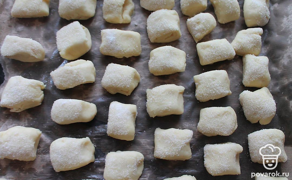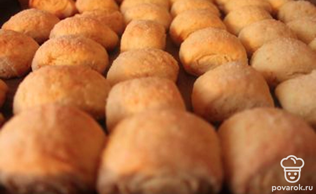 Полоски окунуть одной стороной в сахар и отправить в духовку при 180 градусах. Время выпекания зависит от духовки. Печь до зарумянивания около 20 минут.