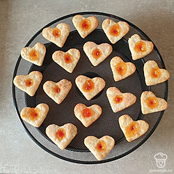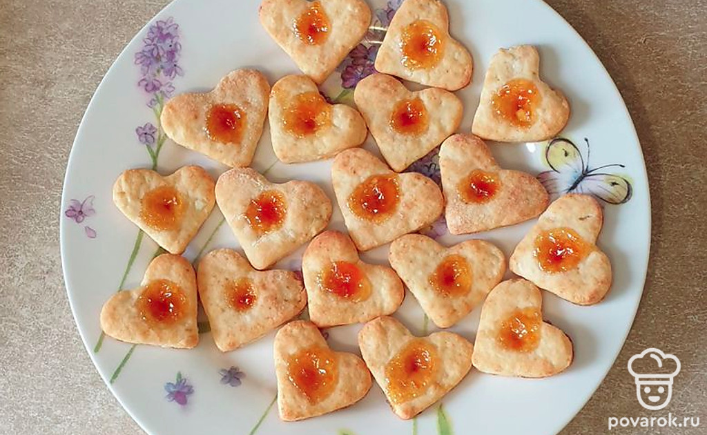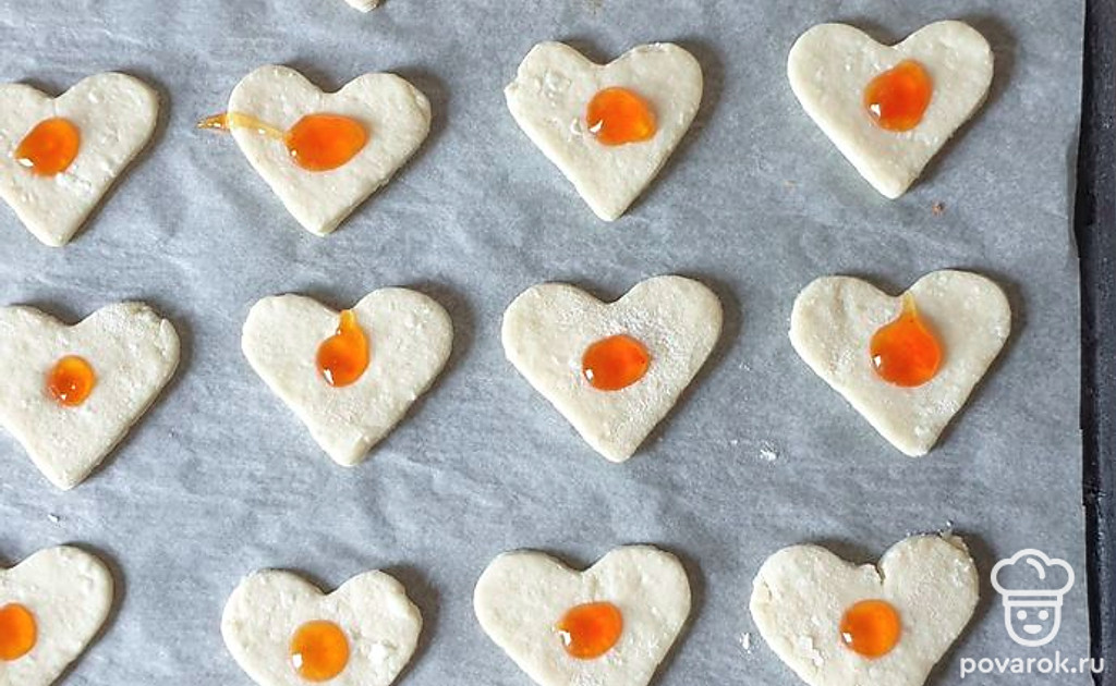 Джем выложите в кулинарный мешок или в обычный пакет и отрежьте уголок. В углубление в печенье выдавите небольшое колличество джема. Выпекайте в заранее разогретой до 180 градусов духовке около 17 минут.