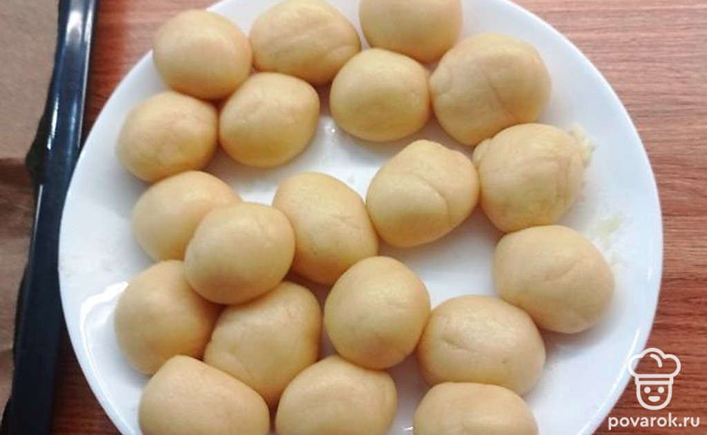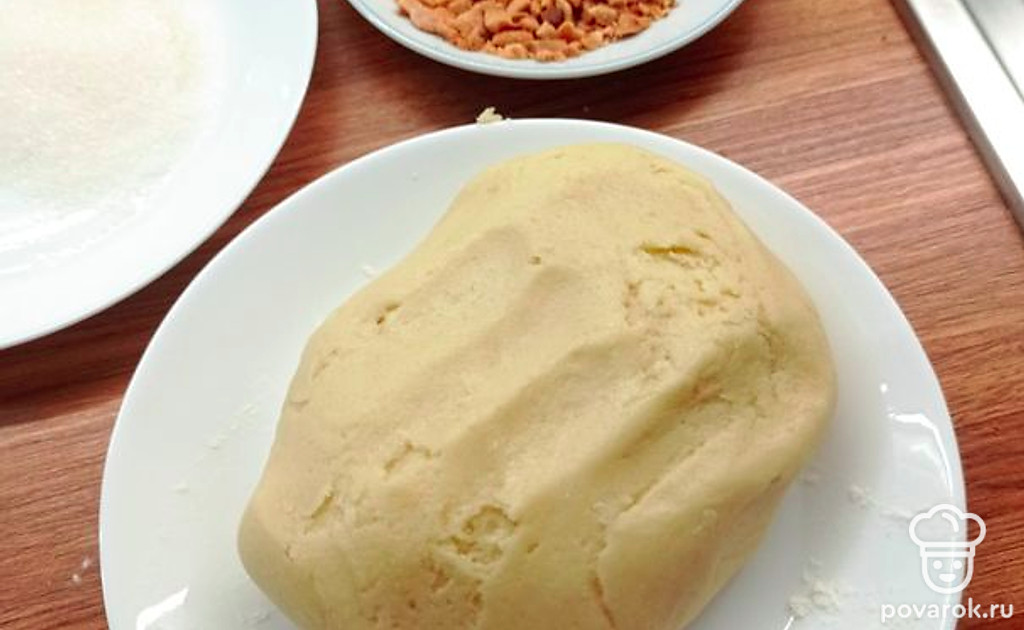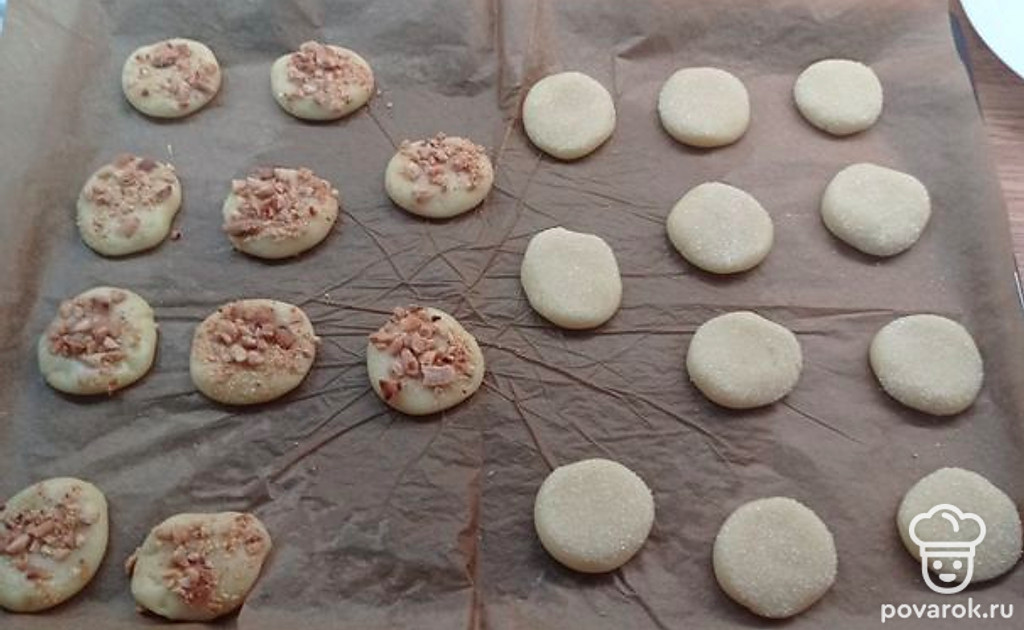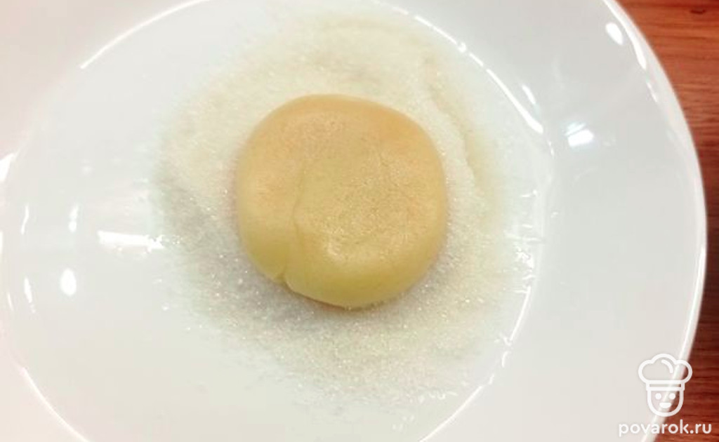 Из шариков делаем небольшие лепешки окунаем в сахар и орех.