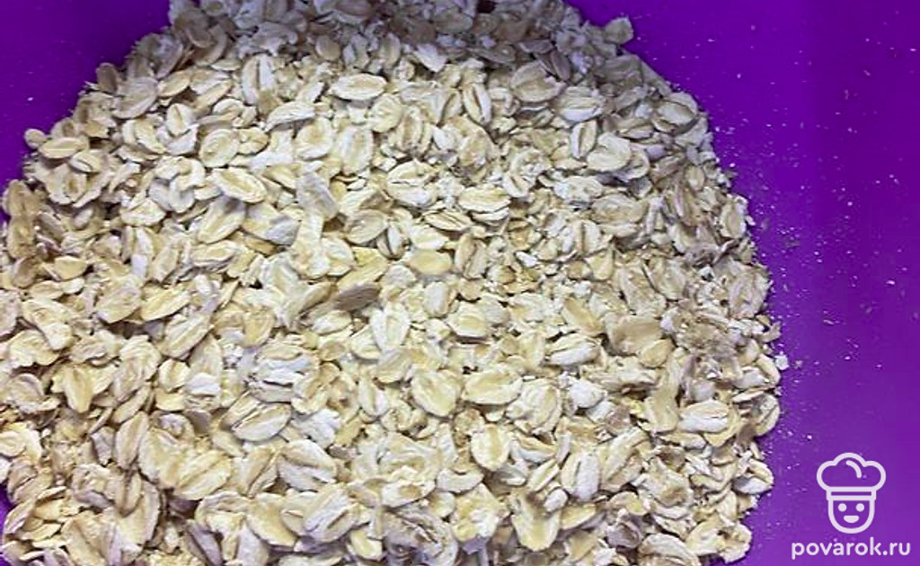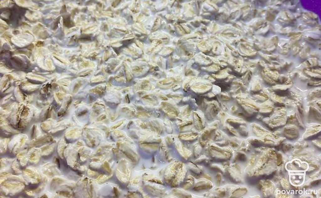 Смешать в одной емкости овсяные хлопья молоко, сахар и изюм. Яйца взбить и добавить в полученную смесь.