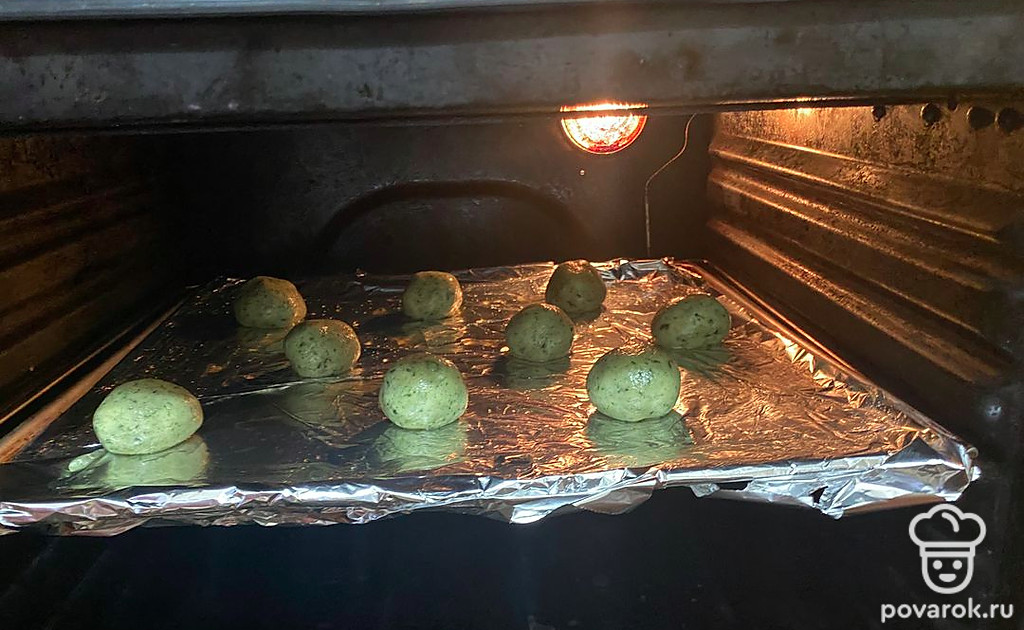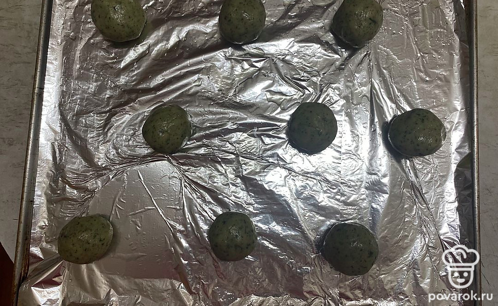 Из теста сформируйте 9 одинаковых шариков и выложите их на форму застеклению фольгой.